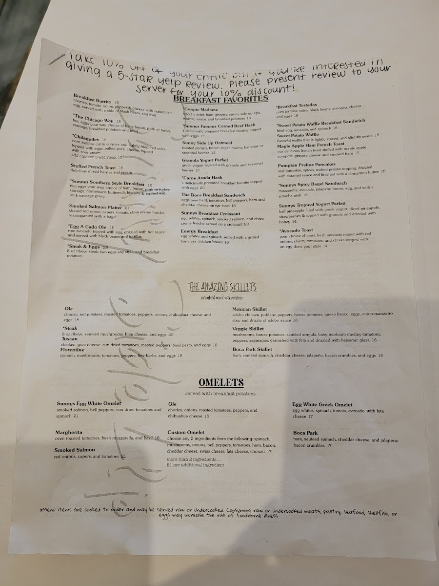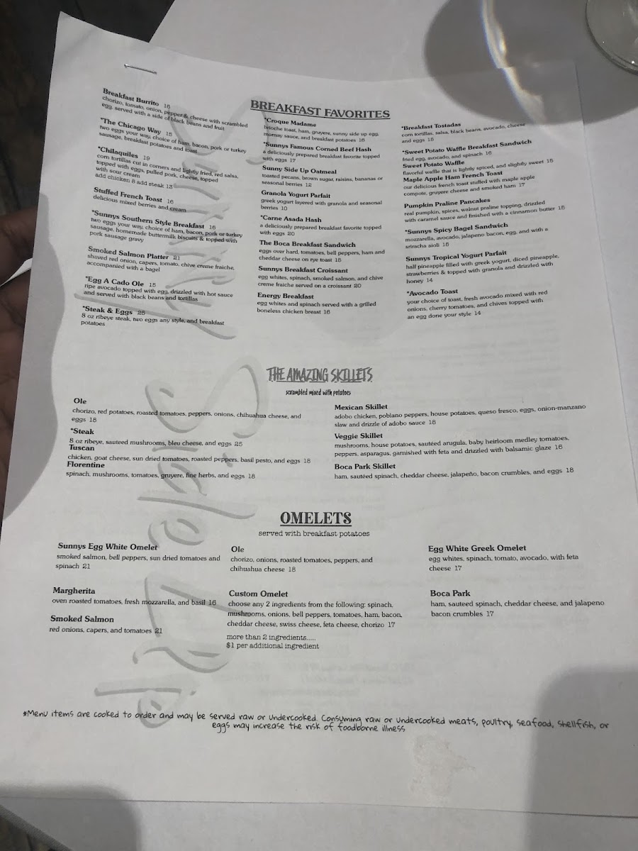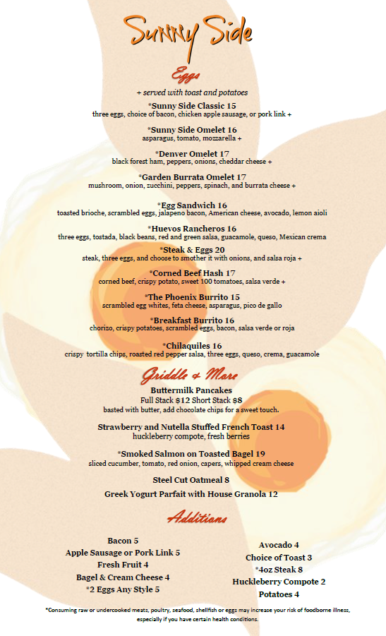 Vegetarian diners will also feel right at home with the enticing Omelets selection. The Sunnys Egg White Omelet is a brilliant blend of smoked salmon, bell peppers, sundried tomatoes, and spinach for $18, while the Margherita Omelet bursts with flavor thanks to oven-roasted tomatoes, fresh mozzarella, and basil for a refreshing $14.